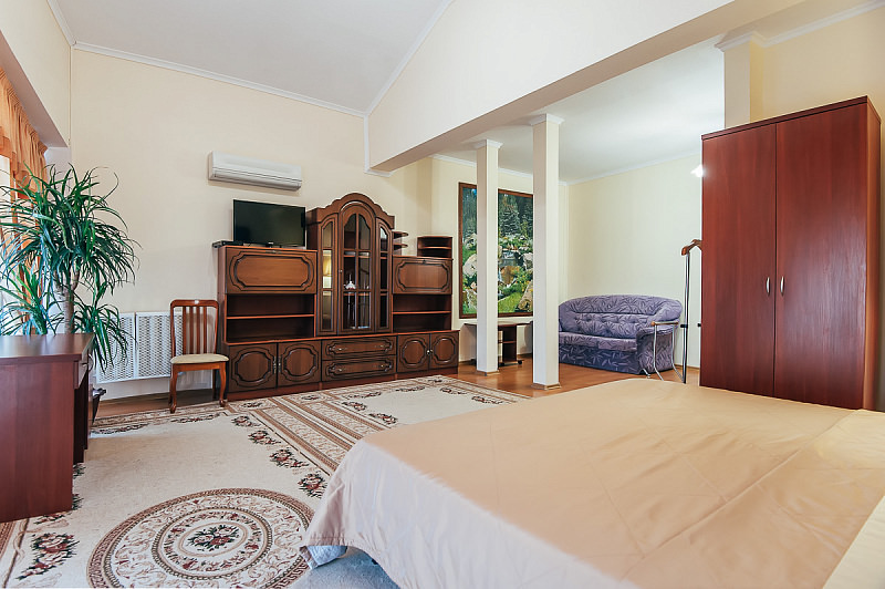 Площадь номера - 25 кв.м. 2 комнаты. 2 осн. места. в ванной комнате: душевая кабина или джакузи. В номере: телевизор; холодильник; кондиционер; фен; туалетные принадлежности; 2-спальная кровать; диван; санузел; полотенца; ванна или душ. 2 доп. места: